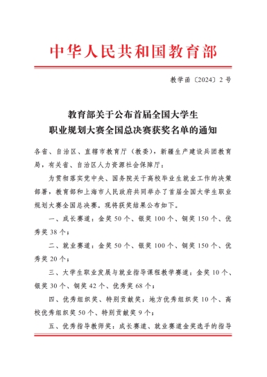 近日,教育部印发《关于公布首届全国大学生职业规划大赛全国总决赛获奖名单的通知》,学校荣获高校优秀组织奖,全国共50所高校获此荣誉。