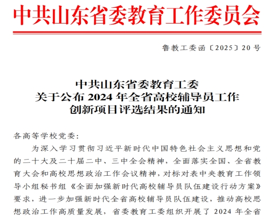 近日,山东省教育厅公布了2024 年全省高校辅导员工作 创新项目评选结果。经各高校推荐、专家评审、网上公示等环节,必赢辅导员刁丽娜、张兴波老师撰写的《创新全链条一体化应急响应体系,构建心理危机多维联动防护网络——高校心理危机协同干预工作案例》获评辅导员工作优秀案例三等奖,刁丽娜老师撰写的《阅己·悦己·越己——心理健康主题班会》、陈蒙蒙老师撰写的《五四精神传薪火 青春挺膺谱华章》荣获辅导员主题班会优秀教案。