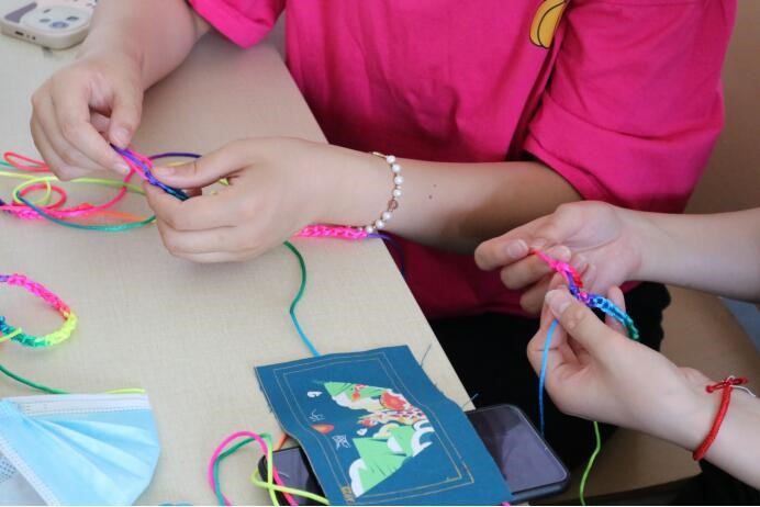 五彩绳,具有祛病强身、迎祥纳福的美好寓意。同学们手拿彩绳,有示范、有学做。左手固定轴线,右手绕线,然后抽、拉、勾……大家一边编织,一边交流所编彩绳的样式及编制技巧,一根根颜色鲜艳、造型美观的五彩绳手链便呈现出来。同学们相互间系上手链,一份份爱在心中传递。