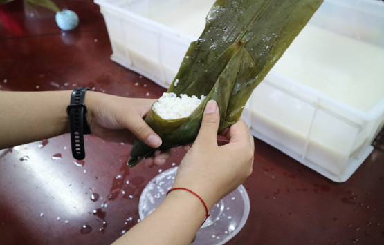 泡糯米、洗粽叶、填糯米、剪粽绳、包扎成型,一道道工序同学们熟记心中。活动现场,同学们体验着叠粽叶、填糯米、塞红枣、裹叶与扎绳的工序,一双双忙碌的手在翠绿的粽叶间穿梭,一个个可爱的小粽子堆满了盘子,谈笑中感受着亲手制作的快乐,享受着和谐美满的节日气氛。