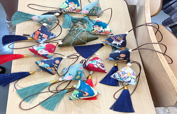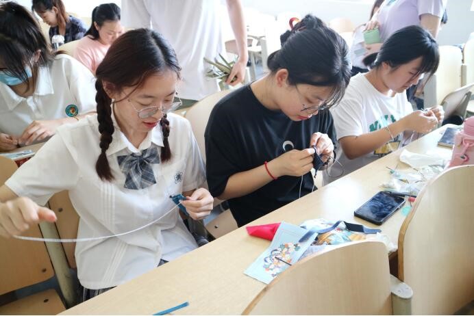 “扈江离与辟芷兮,纫秋兰以为佩。”香囊,不仅有避邪驱瘟之意,而且有襟头点缀之风。同学将艾草研成粉末、装进香囊,再经一针一线的细致缝合,一个个造型别致的香囊横空出世。大家佩戴在身上,一起分享成功的喜悦。