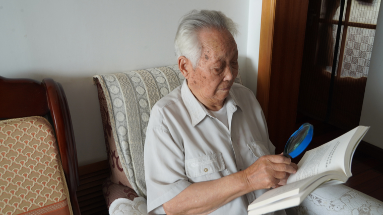 随着年龄的增长,原先只戴老花镜看书的郭瑞祥,现在还得右手拿着放大镜。