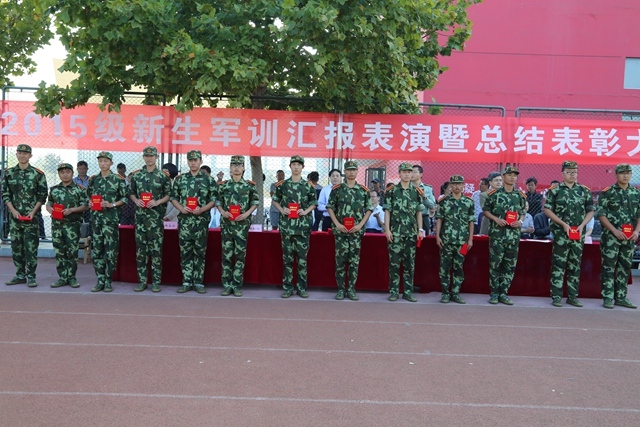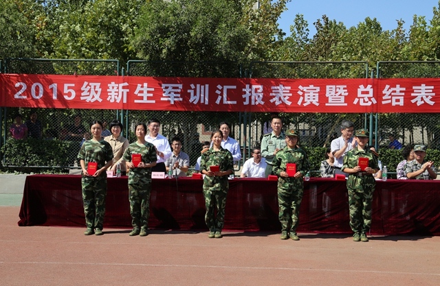 汇报表演结束后,副院长张兆明宣读了《关于表彰2015级新生军训先进集体、优秀学员的通报》、《关于对2015级优秀新生进行奖励的决定》,获奖单位和学生个人分别上台领奖。