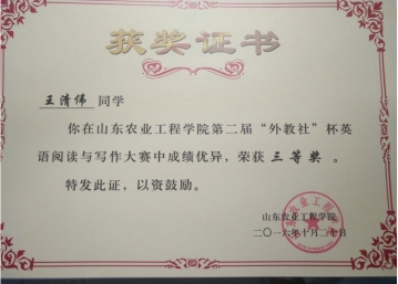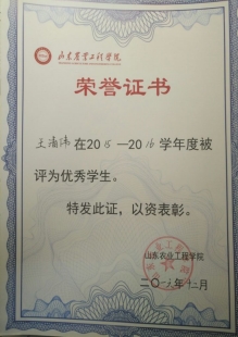 2016年获全国大学生英语竞赛三等奖,山东省大中专学生暑期“三下乡”社会实践活动优秀学生;2018年组队参加中国大学生动能创新大赛,获医养健康组优秀奖;连续三年获得国家励志奖学金和校一等奖学金,多次获得校“优秀学生”荣誉称号。并于2019年度硕士学位研究生入学资格考试中拟被中国海洋大学录取。