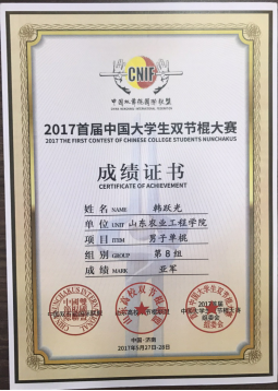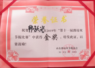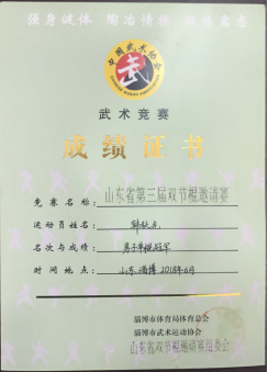 他以弘扬武术运动,振奋民族精神为己任。一直置身于山东双节棍运动的学习宣传和双节棍体育文化的传播中。荣获2017首届中国大学生双节棍大赛一等奖,并取得男子单棍套路及男子竞速亚军的优秀成绩。同年参加“山东高校双节棍联盟第三届双节棍交流赛”斩获单棍冠军。2018年两次参加山东省内双节棍邀请赛获单棍冠军,并应邀参加山东综艺频道黄金强档娱乐节目“超级大明星”。2018至2019年期间曾参与潍坊市、淄博市、山东商职院、山工院等举办的双节棍庆典与交流大会,积极传播双节棍文化,弘扬体育精神。