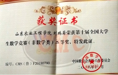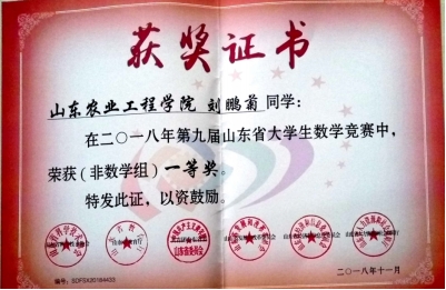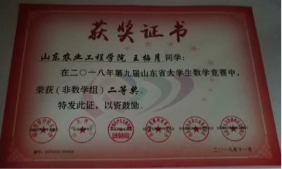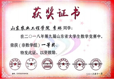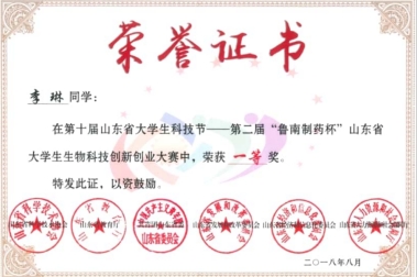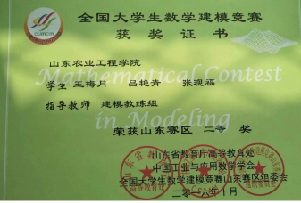 多次参加数学竞赛、数学建模竞赛,连获省一等奖、国家三等奖;带领团队积极参加创新创业大赛,获第九届山东省大学生科技节特等奖,第二届山东省大学生生物科技创新创业大赛一等奖,第四届山东省“互联网+”大学生创新创业大赛铜奖等,2017年获山东省大学生优秀创客称号。