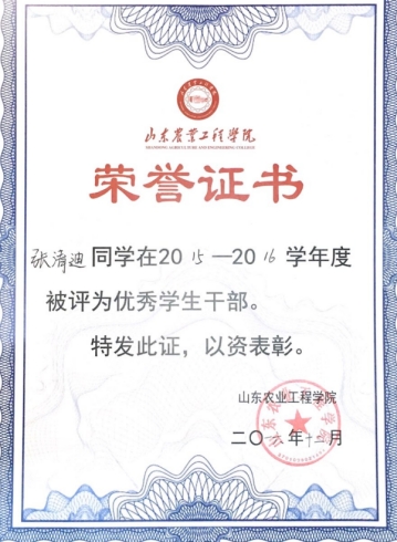 他曾担任国土资源与测绘工程学院第30届学生会副主席,策划、组织校、院活动数十项,每天五小时的休息时间已经成为他的正常生活状态。他带领学生会成员获得“党员红色精神宣讲团”、“山东省优秀服务队”等多个荣誉。3年来,他带领社团考取专业软件操作证书200余份,国家级奖项4项。身为班长,他带领班级在学院读报知识大赛中荣获第一名,获“优良学风班”荣誉称号,连续四年获得校优秀班集体荣誉称号,2017年获“山东省先进班集体”荣誉称号,在2018年BIM算量大赛中获得“优秀组织者”荣誉称号等。他个人也多次获得“山东省优秀班干部”、“山东省优秀毕业生”,校“优秀学生干部”、“校级优秀团干部”。
