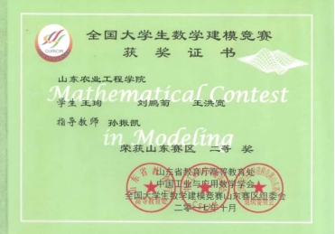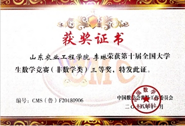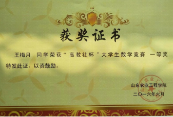 步入大学以来,她一直通过自己的努力,不断进取、顽强拼搏。大学两年荣获国家励志奖学金、校奖学金。她充分利用业余时间,参加了许多全国乃至国际级比赛,并荣获亚太地区大学生数学建模竞赛三等奖、美国大学生数学建模竞赛三等奖。在全国大学生数学竞赛、全国大学生数学建模大赛、全国大学生英语竞赛中收获多个奖项,并在大学四年考取计算机三级、四级证书。在校期间多次获得校优秀团干部、优秀社团个人等荣誉称号。并在2019年度硕士学位研究生入学资格考试中以笔试面试均第一的成绩考入山东农业大学。