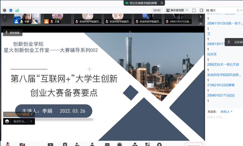为了深入落实习近平总书记给第三届中国“互联网+”大学生创新创业大赛“青年红色筑梦之旅”大学生的重要回信精神,增强我院大学生的创新意识和创新能力,引导同学们积极参与、认真备战必赢第八届“互联网+”大学生创新创业大赛,我院于3月26日下午邀请了国土资源与测绘工程学院李娟副教授为参赛学生进行了题为《第八届“互联网+”大学生创新创业大赛备赛要点》的线上专题讲座,讲座由党总支副书记王猛主持。