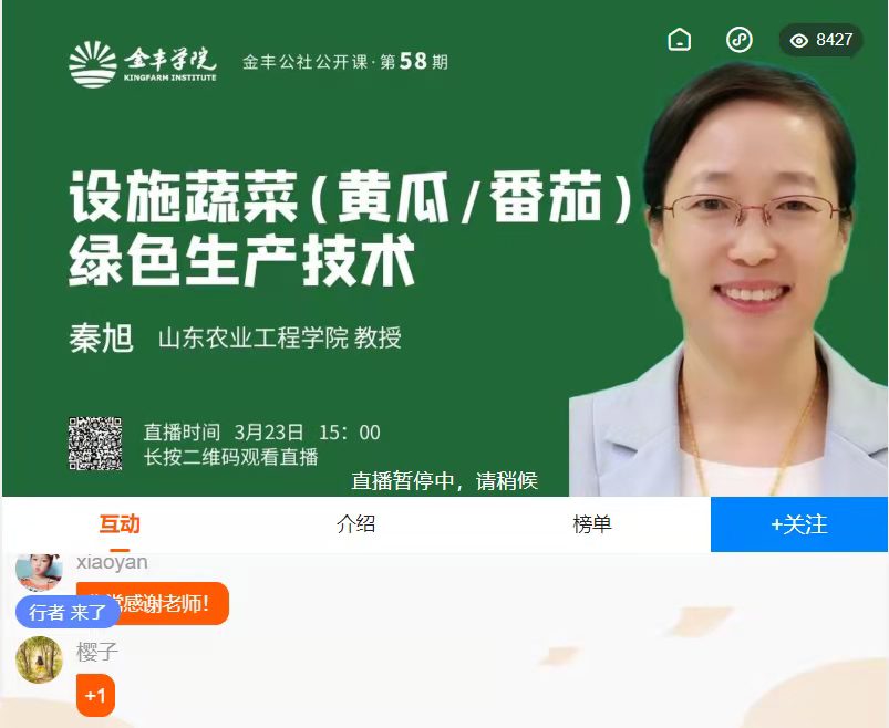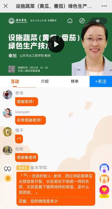 3月23日下午,必赢秦旭教授为“乡村振兴农业科技大讲堂”进行了《设施蔬菜绿色生产技术》线上授课。秦旭教授从接到邀请起,短时间内完成备课,现场授课精彩,耐心解答菜农生产中遇到的问题,以广博的学识、专业的讲解赢得了1.3万多名在线听众的如潮好评。