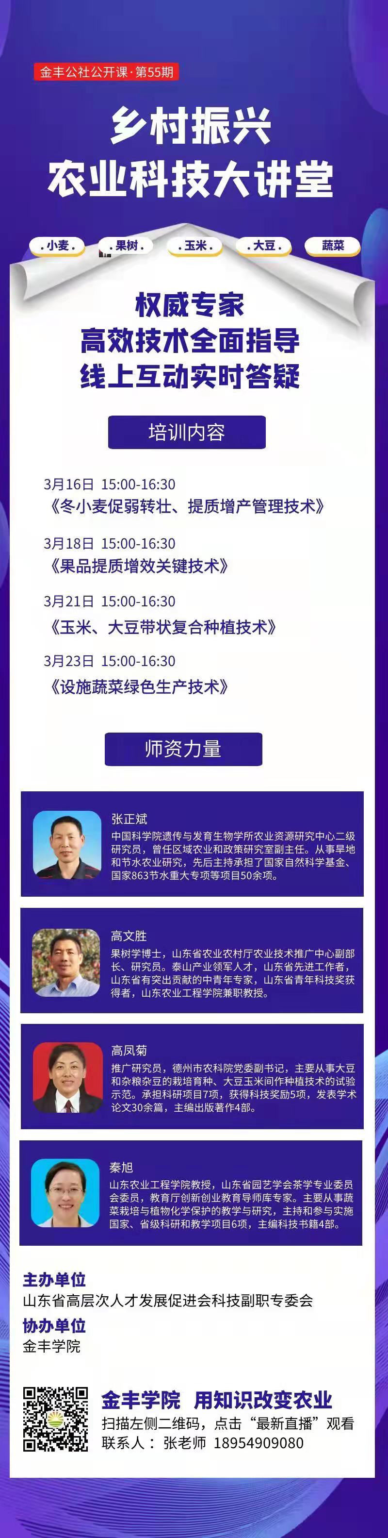 防疫抗疫齐努力,线下线上忙春耕。近日,山东省高层次人才发展促进会科技副职专委会线上主办“公益助农·科技赋智”乡村振兴农业科技大讲堂活动。活动邀请小麦、蔬菜和果树领域4名知名专家进行了授课,全国共有近4万名农民朋友、“三农”一线技术人员和农业院校大学生在线收听收看。