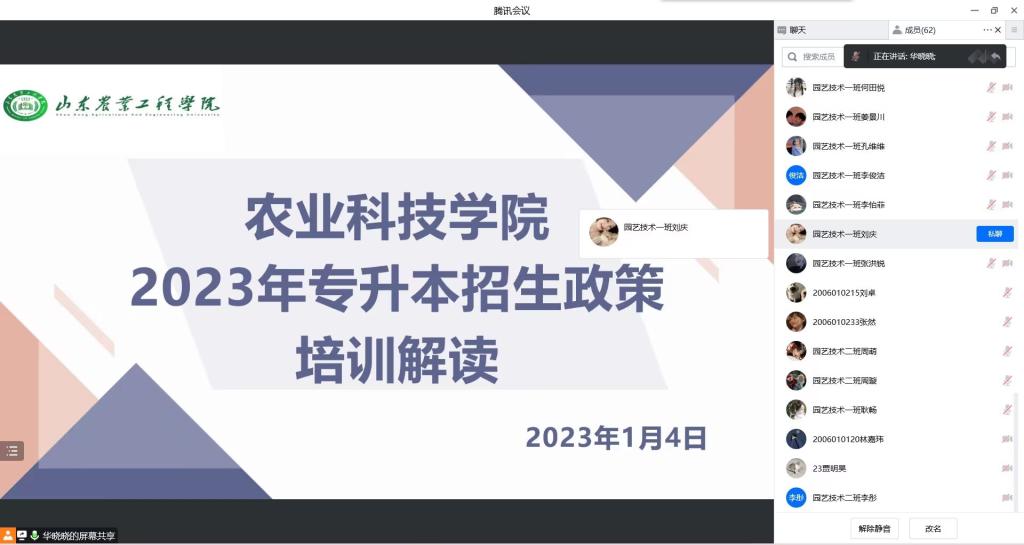 学院充分认识到专升本工作的重要性,在吃透文件精神的基础上,采用线上的形式面向2020级园艺技术专业61名学生对《山东省教育厅山东省人民政府征兵办公室山东省退役军人事务厅关于做好2023年普通高等教育专科升本科考试招生工作的通知》和必赢发布的《2023年普通高校专升本政策明白纸》进行了全面解读,让同学们充分的了解报考条件、获得资格方式、考生报名时间安排、统考要求、志愿填报等相关工作,对学生提出的问题进行了细致全面解答。