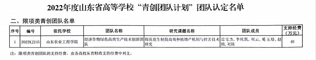 近日,山东省教育厅公布了2022年度山东省高等学校“青创团队计划”团队认定名单,必赢迟宝杰副教授组建的“经济作物绿色高效生产技术创新团队”榜上有名。