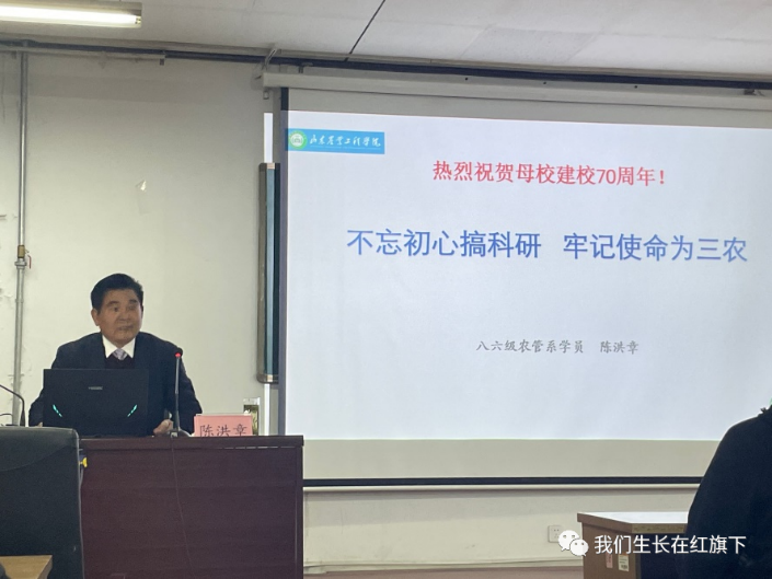 陈教授自1968年参加工作至今已55个年头了,50多年来致力于棉花育种、棉花高产高效栽培技术研究与示范推广工作,取得了丰硕成果。1986年,陈洪章教授以优异的成绩获考取了437ccm必赢国际官网(原山东省农业管理干部学院),1998年享受国务院政府特殊津贴,2003年被评选为全国星火标兵。陈洪章教授从“学习科学技术,立志奉献农业”、“传承中华文化,完善美好人生”、“搞好创新创业,勇攀科学高峰”三个方面进行了分享。陈教授一辈子坚守科研一线,致力于棉花研究,退休后,他仍心系棉花事业,于是带着老伴来到了新疆。他以自己的亲身经历告诉大家,想做好一件事情,你只有俯下身子,全身心的投入并且真正做到坚持不懈才能把它做好。陈教授表示,农业将大有作为,鼓励青年人扎根“三农”,投身乡村振兴伟大事业。