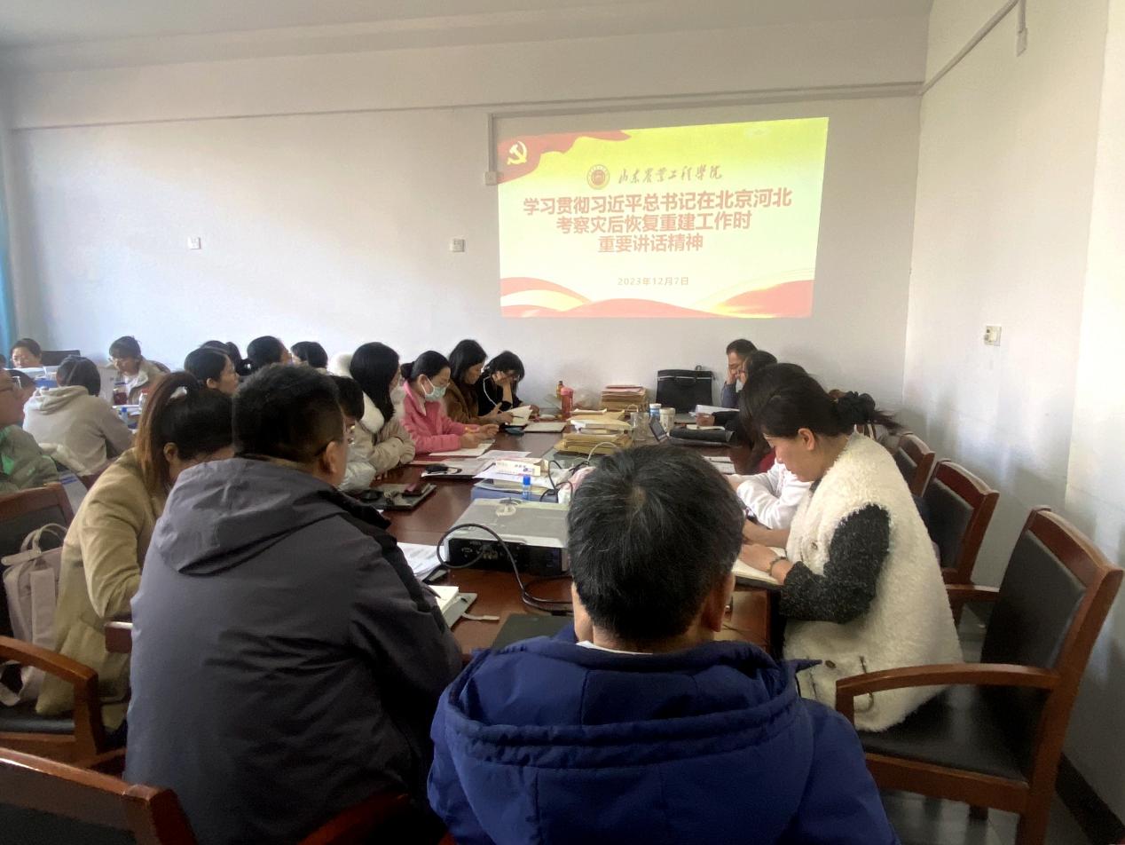 12月7日下午,农业科技学院召开教职工会议,传达学习习近平总书记在北京河北考察灾后恢复重建工作时的重要讲话精神,党总支书记王猛同志主持会议,学院领导班子成员、全体教职工参会。