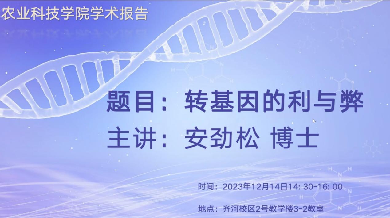 12月14日下午,我院动物医学专业教师安劲松博士为2022级设施农业科学与工程专业、园艺专业学生作为题为《转基因的利与弊》的线上报告。安劲松博士主要事动物医学方面的教学与科研工作,研究方向是动物生殖生理与胚胎工程,参与省级以上科研、教研项目4项,发表SCI论文5篇。
