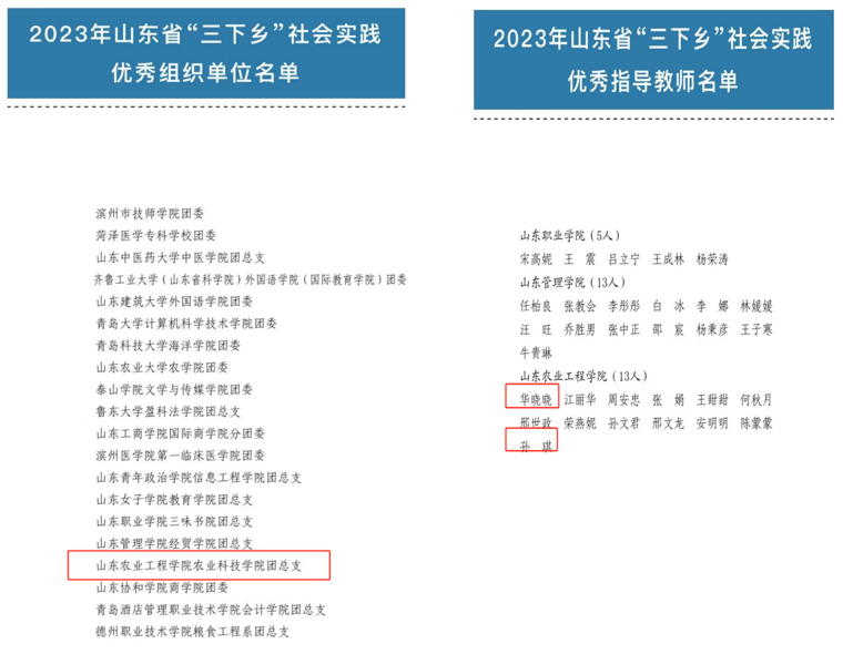 近日,团省委公布了2023年暑期“三下乡”社会实践活动获奖名单。其中,我院团总支获评“优秀组织单位”,孙琪、华晓晓老师获评“优秀指导教师”,宋家骏、张瑞农、张保鑫同学获评“优秀学生”,“习语润心”山东革命精神寻访宣讲团获评“优秀服务团队”。