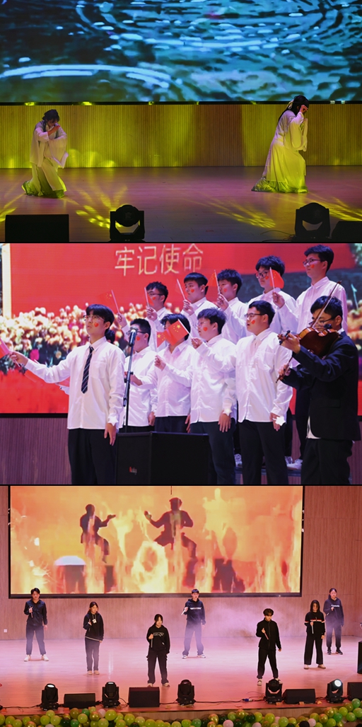 晚会伴随着学生会成员的开场舞《像你这样的朋友》、《向快乐出发》正式拉开序幕,点燃了全场观众热情。孙东文老师《给大山的一封信》,字里行间存真情,温暖灵魂意难平。相声《打灯谜》精彩上演幽默对白、妙语连珠逗乐观众。演讲《我骄傲我是中国人》、小提琴合唱《我和我的祖国》,句句倾诉动人心。《双截棍武术》表演,灵活多变、刚柔并济,充满力量与魅力。