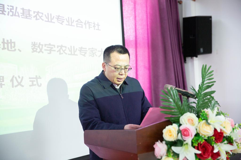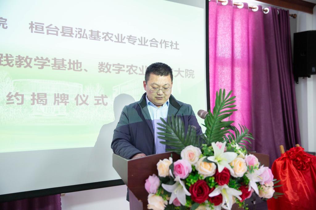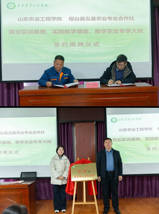 3月4日,农业科技学院与桓台县泓基农业专业合作社成功举办“刘进教授数字农业专家大院”揭牌暨签约仪式。学院党总支书记王猛、副院长刁有江、刘进教授、孙东文教授,桓台县副县长徐吉民、县农业农村局党组书记、局长王晓玲、新城镇党委副书记、镇长史晓静、泓基农业理事长于昌江等出席仪式。