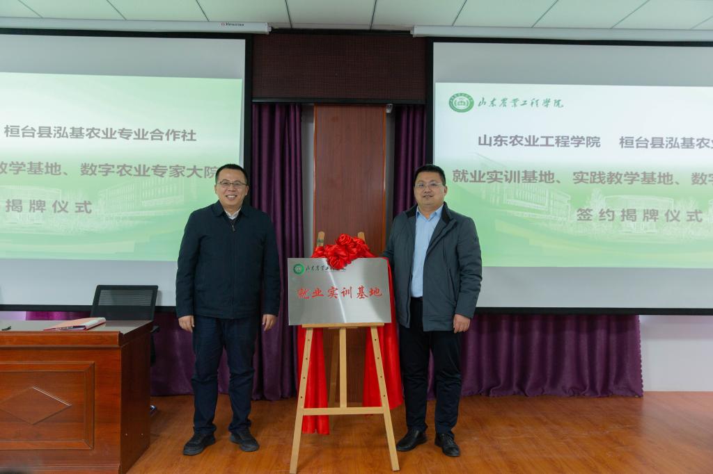 王猛书记与桓台县副县长徐吉民与共同为“就业实训基地”揭牌,副院长刁有江与桓台县农业农村局局长王晓玲为“实践教学基地”揭牌。副院长刁有江与桓台县泓基农业专业合作社理事长于昌江代表双方签署合作协议。
