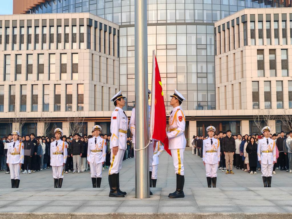 清晨,曙光初照,国旗护卫队迈着整齐有力的步伐,护送五星红旗走向升旗台。队员们身姿挺拔,眼神坚定,尽显青春朝气与庄重肃穆。随着激昂的《义勇军进行曲》奏响,五星红旗缓缓升起,在春日的微风中飘扬。全体师生庄严肃立,向国旗行注目礼。