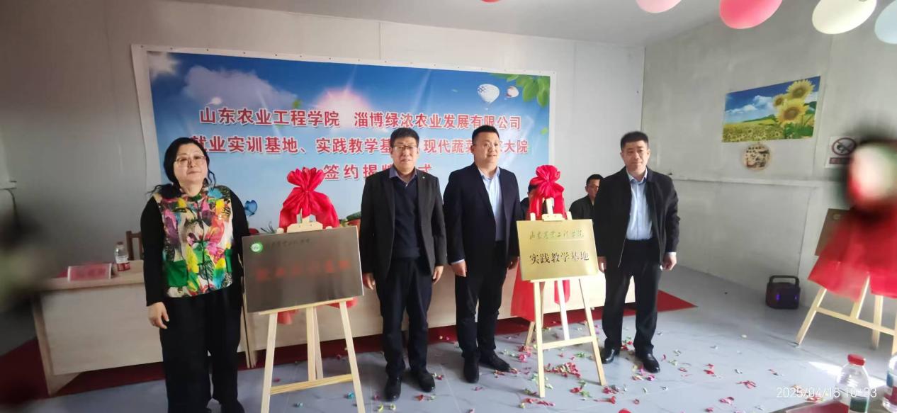 王猛书记、刁有江副院长、淄博数字农业农村发展中心刘振国副主任、淄博绿浓农业发展有限公司张惠卿董事长,共同为“就业实训基地” 和“实践教学基地”揭牌。