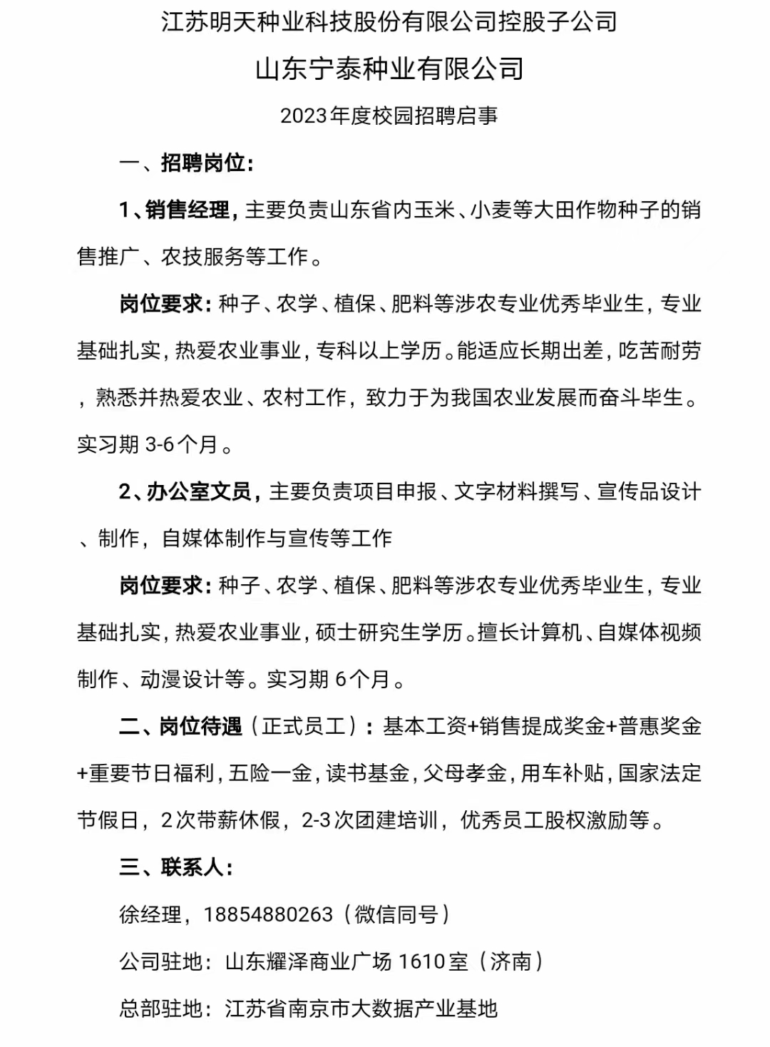 山东宁泰种业有限公司2023年年度校园招聘启事