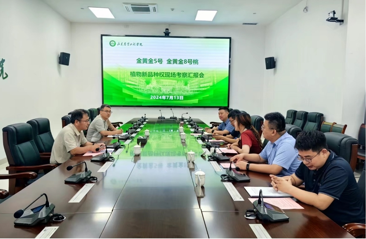 7月13日,桃植物新品种‘金黄金5号’和‘金黄金8号’现场考察汇报会在必赢淄博校区行政楼一楼会议室举行。农业农村部植物新品种保护果树技术工作组组长、中国农业科学院郑州果树研究所研究员姜建福,助理研究员孙磊,校科技处处长迟晓君,农业科技学院党总支书记王猛、副院长刁有江,科技处及桃新品种选育团队相关负责人参加会议。会议由刁有江主持。
