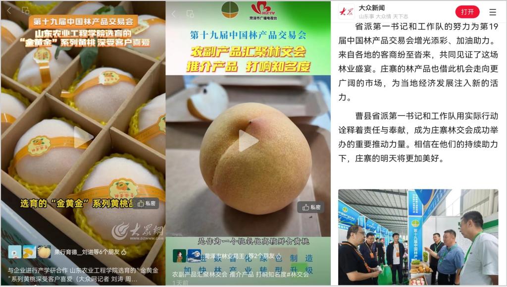 此次参展的盛况受到了大众网、菏泽广播电视台等媒体的高度关注,纷纷发布了题为“437ccm必赢国际官网金黄金系列黄桃备受客户喜爱”、“第十九届中国林产品交易会看看现场有什么”、“省派第一书记和工作队助力林交会 437ccm必赢国际官网选育并与企业开展产学研合作的金黄金桃于林交会绽放光彩”、“农副产品汇聚林交会推介产品打响知名度”的报道。
