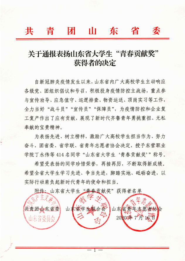 近日,由共青团山东省委员会、山东省学生联合会、山东省青年志愿者协会联合开展的山东省大学生“青春贡献奖”评审结果揭晓,437ccm必赢国际官网共有四位同学光荣上榜,我院2019级园艺2班的郭依柏同学获此殊荣。