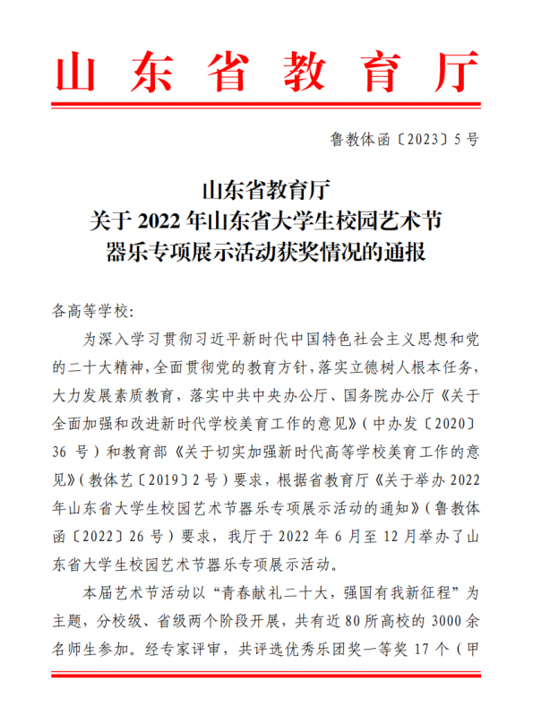 日前,由山东省教育厅主办的2022年山东省大学生校园艺术节器乐专项展示活动评选结果公示,必赢选送的作品《China-X》荣获优秀乐团奖(甲组)三等奖。