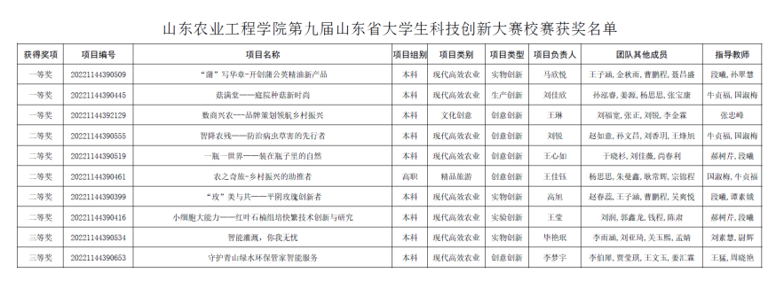 第九届山东省大学生科技创新大赛于日前落下帷幕,本届大赛共吸引全省145所高校的22.7万个项目、43.9万名学生报名参赛。自大赛启动以来,我院积极宣传发动、精心组织,本次比赛共获校赛一等奖3项、二等奖5项、三等奖2项,其中《“蒲”写华章-开创蒲公英精油新产品》、《菇满堂——庭院种菇新时尚》、《数商兴农---品牌策划领航乡村振兴》入围第九届山东省大学生科技创新大赛省赛。