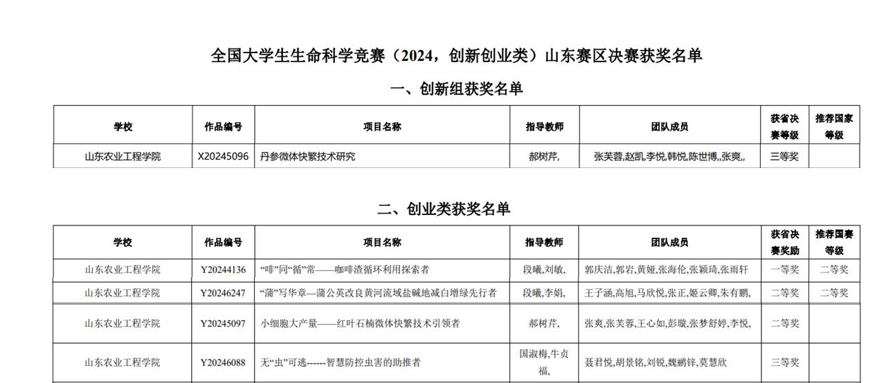 6月22日,全国大学生生命科学竞赛(2024,创新创业类)山东赛区决赛在聊城大学隆重举行。经过激烈角逐,我院荣获创业组一等奖一项、二等奖两项、三等奖一项,创新组三等奖一项,充分展现了农业科技学院学子的创新创业综合素质。