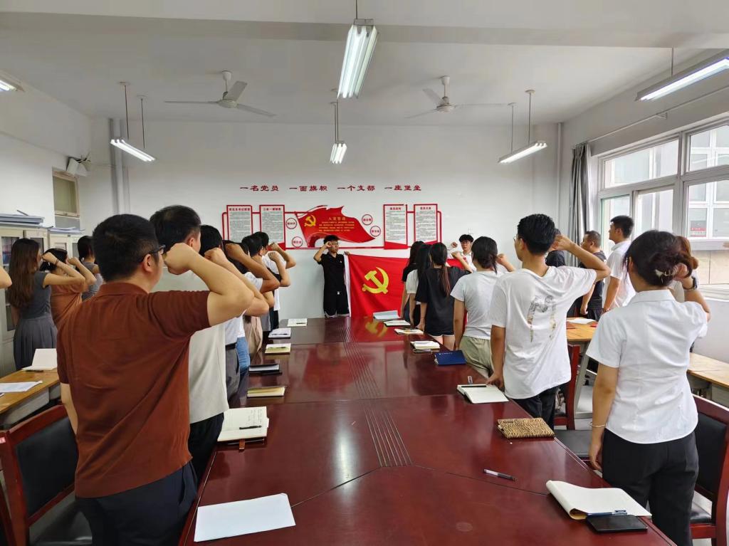 面向鲜红的党旗,全体党员同志握紧右拳,重温入党誓词,重忆入党初心。