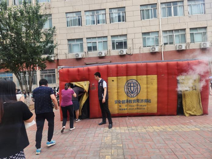 演练现场,教职工按照工作人员的疏散指令,以湿毛巾、口罩或衣物等捂住口鼻,按照逃生指示线路,弯腰、低头依次从“消防体验帐篷”的入口进入,感受火灾发生时的现场状态,并按照帐篷内的标识寻找正确的道路,尝试在模拟的逃生通道里进行紧急疏散和自救,最后快速从出口“逃生”。