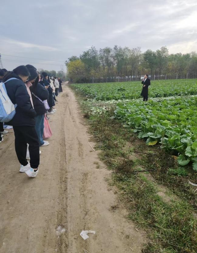 第一站,学生们来到冬日里最常见的蔬菜——大白菜的种植区。在这里,孙东文老师耐心地向学生们介绍了大白菜的生长习性、营养价值以及种植技巧,大家听得津津有味,对大白菜有了更加深入的了解。