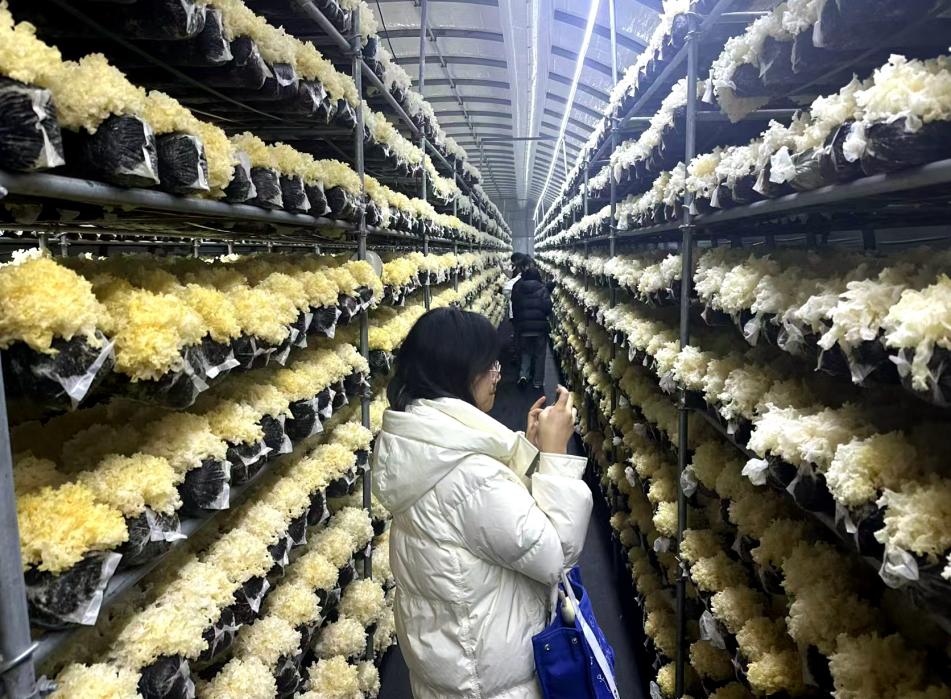 在平菇种植区,同学们看到了一种新型的立体种植模式,这种模式通过搭建多层菌架,充分利用了温室大棚内的空间,使得单位面积的产量得到了大幅提升。同学们还注意到,基地在食用菌的加工方面也下足了功夫。如菌酒,羊肚菌礼盒等,从而提高了产品附加值和竞争力。