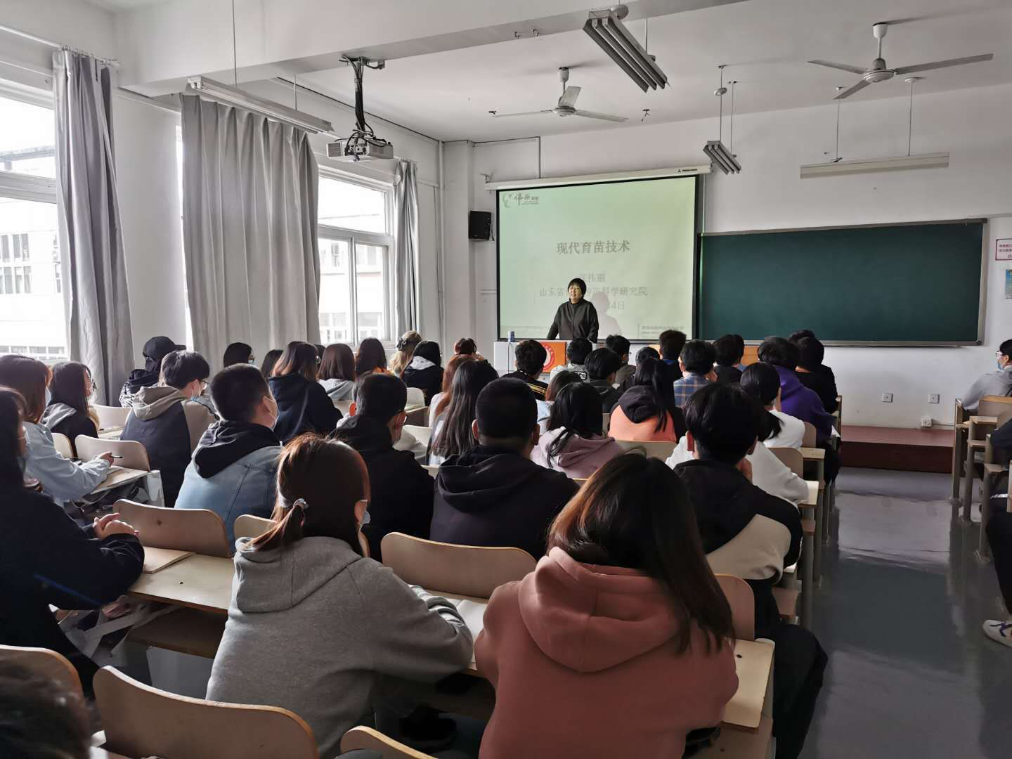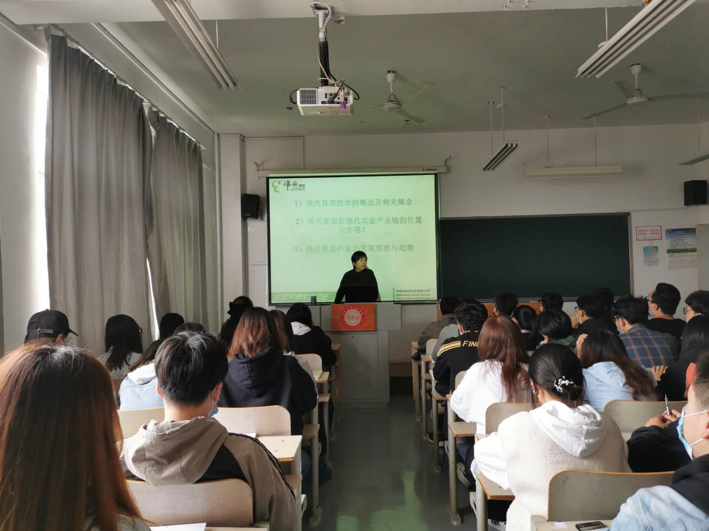 2020年10月14日,农业科技学院特邀山东伟丽种苗有限公司张伟丽总经理为18级园艺专业同学教授现代育苗技术,本次课堂共68人参与,讲台上,张经理讲得有条不紊,讲台下,同学们听得全神贯注。