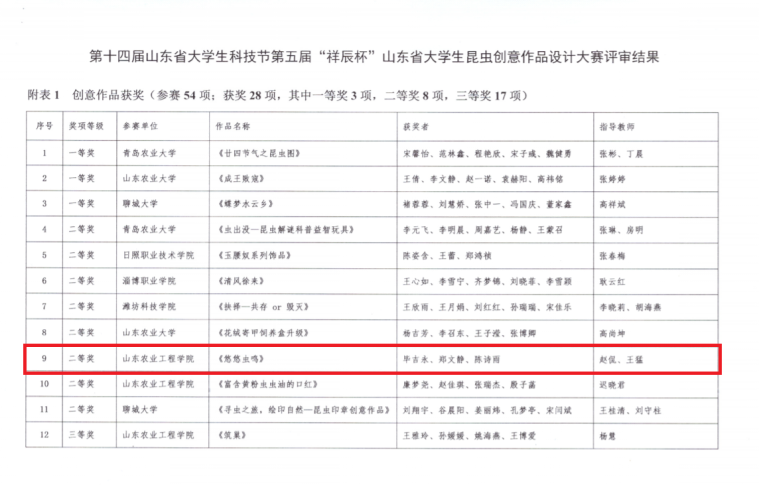 11月5日,第五届‘祥辰杯’山东省大学生昆虫创意作品设计大赛落下帷幕。我院1支队伍进入决赛,并最终获得创意竞赛模块二等奖。