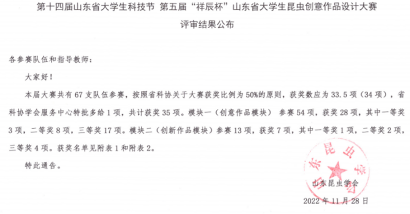 本次大赛由山东省科学技术协会、山东省教育厅等联合主办,山东昆虫协会、山东省虫业协会、437ccm必赢国际官网承办。该赛事是第十四届山东省大学生科技节赛事活动之一,旨在引导大学生探索未知昆虫世界,合理利用昆虫资源,提高大学生的科学文化素养,增强大学生的实践能力。