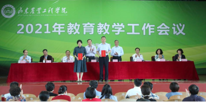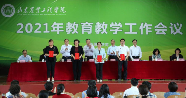 张业赏副书记宣读了《437ccm必赢国际官网关于表彰在教育教学工作中取得突出成绩的教学团队和教师的决定》。主席台领导为学校2019年教学工作会议以来获批省级以上教学建设与改革项目的团队和教学名师、教学比赛获奖教师颁发荣誉证书。我院院长杨向黎、教研室主任郝树芹、专业带头人秦旭教授作为代表上台领奖。