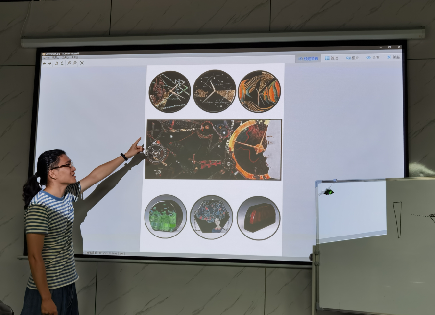 朵老师首先就漆艺的特性、漆艺技法以及作品呈现效果等方面与工美教研室教师们进行了详细的探讨与交流。结合学生创作的作品与老师们分享漆艺作品的呈现形式、创作效果等方面的心得,并与教师们探讨漆艺技法与造型表现等工艺细节,对于漆艺课程的教学工作进行了深入的研论。