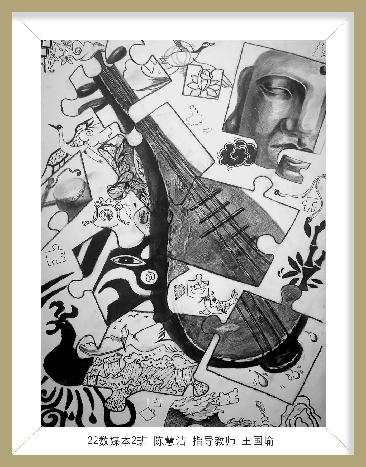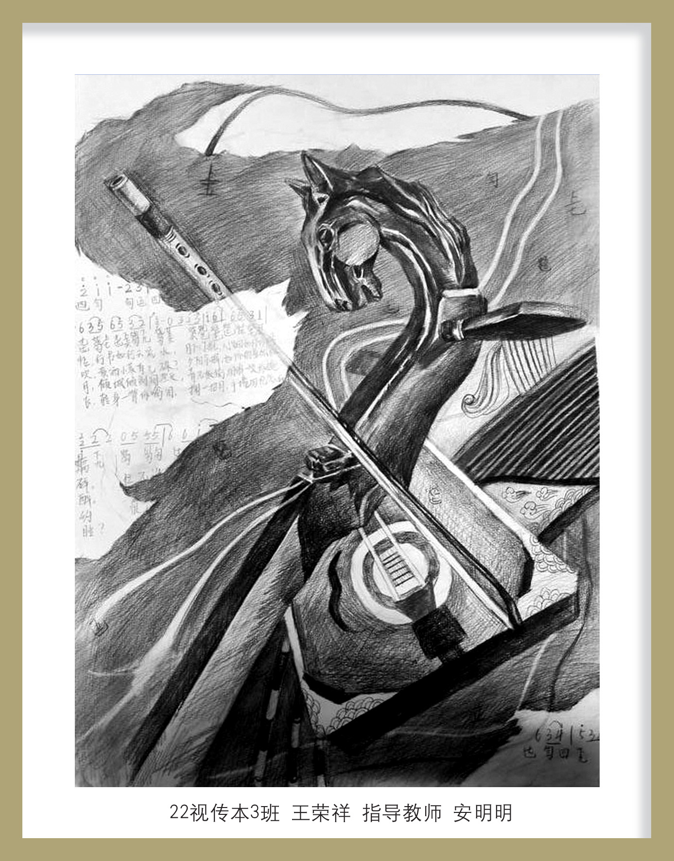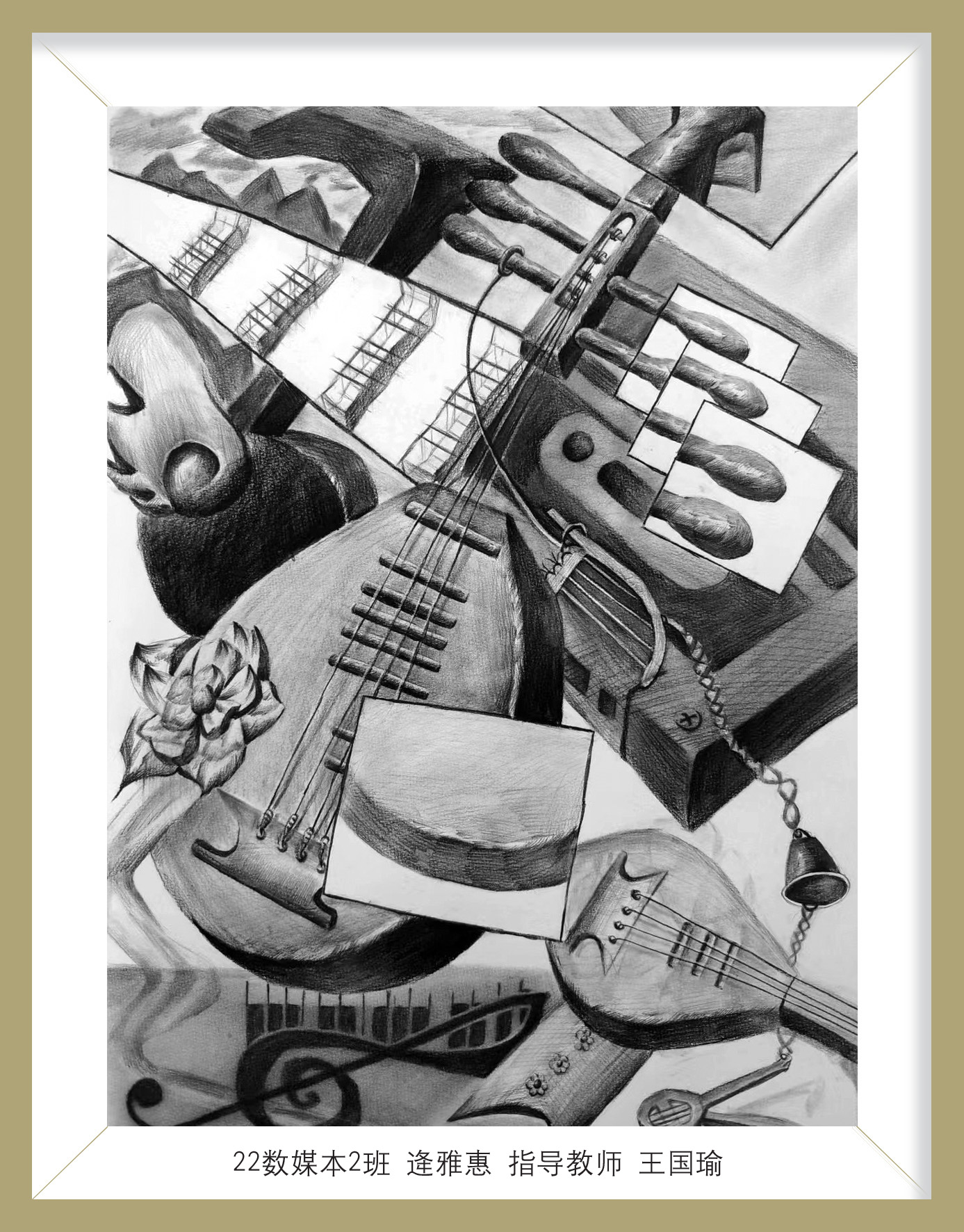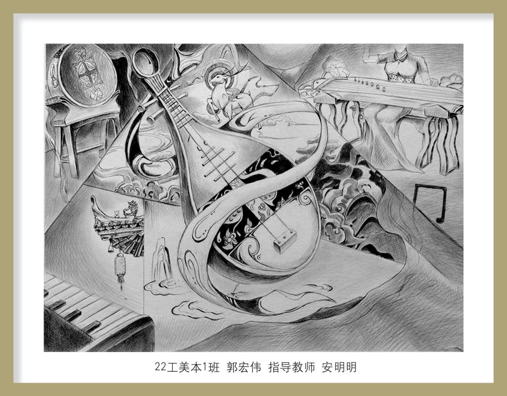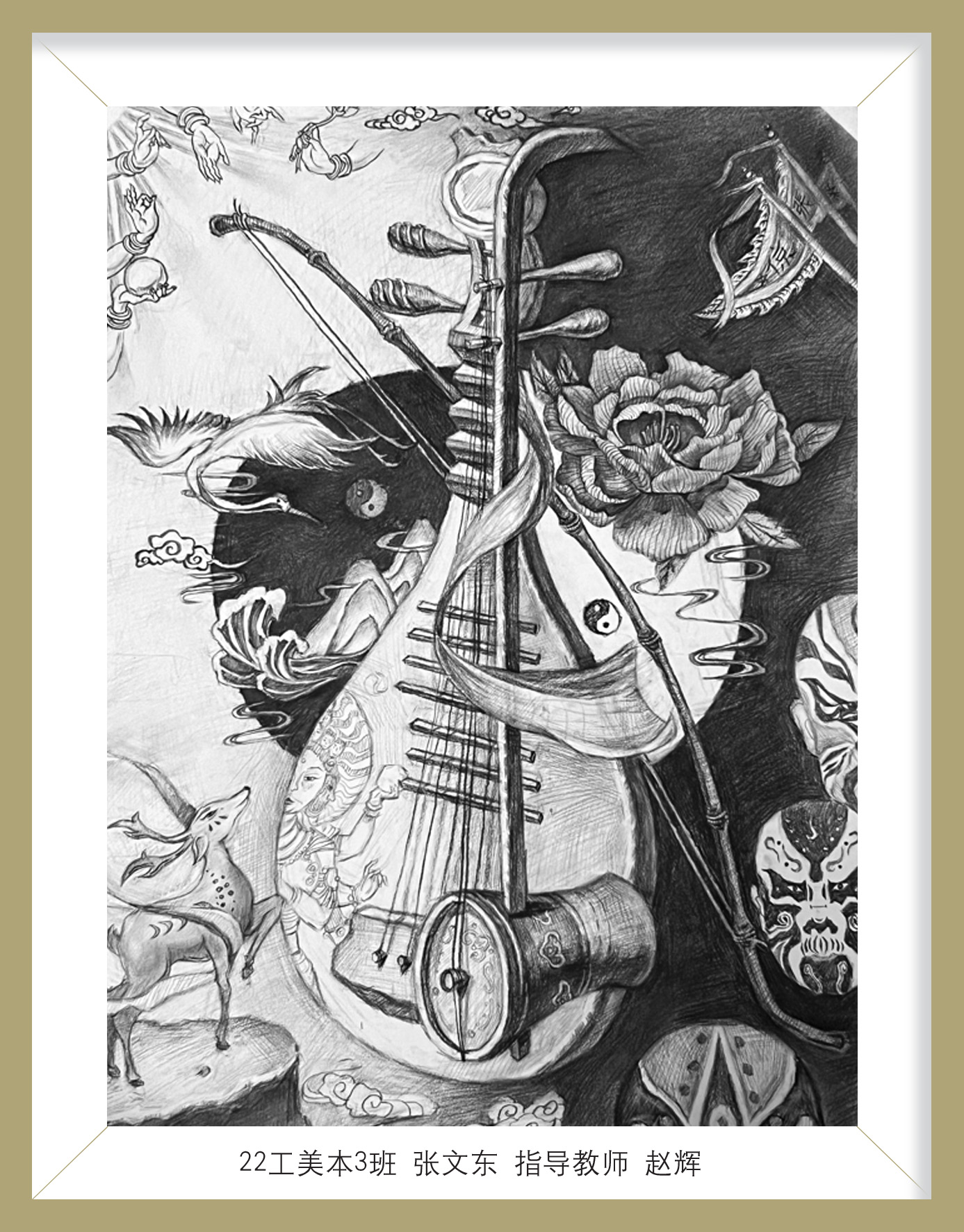 “综合创意素描训练”实训项目要求以“中国音乐”为主题,搜集相关元素(中国音乐符号、中国乐器、中国图形元素等)进行组合创意设计。要求学生综合运用各种造型设计方法进行大胆的创意设计表达,独立创作设计素描作品,以下展示的是部分学生优秀作品。