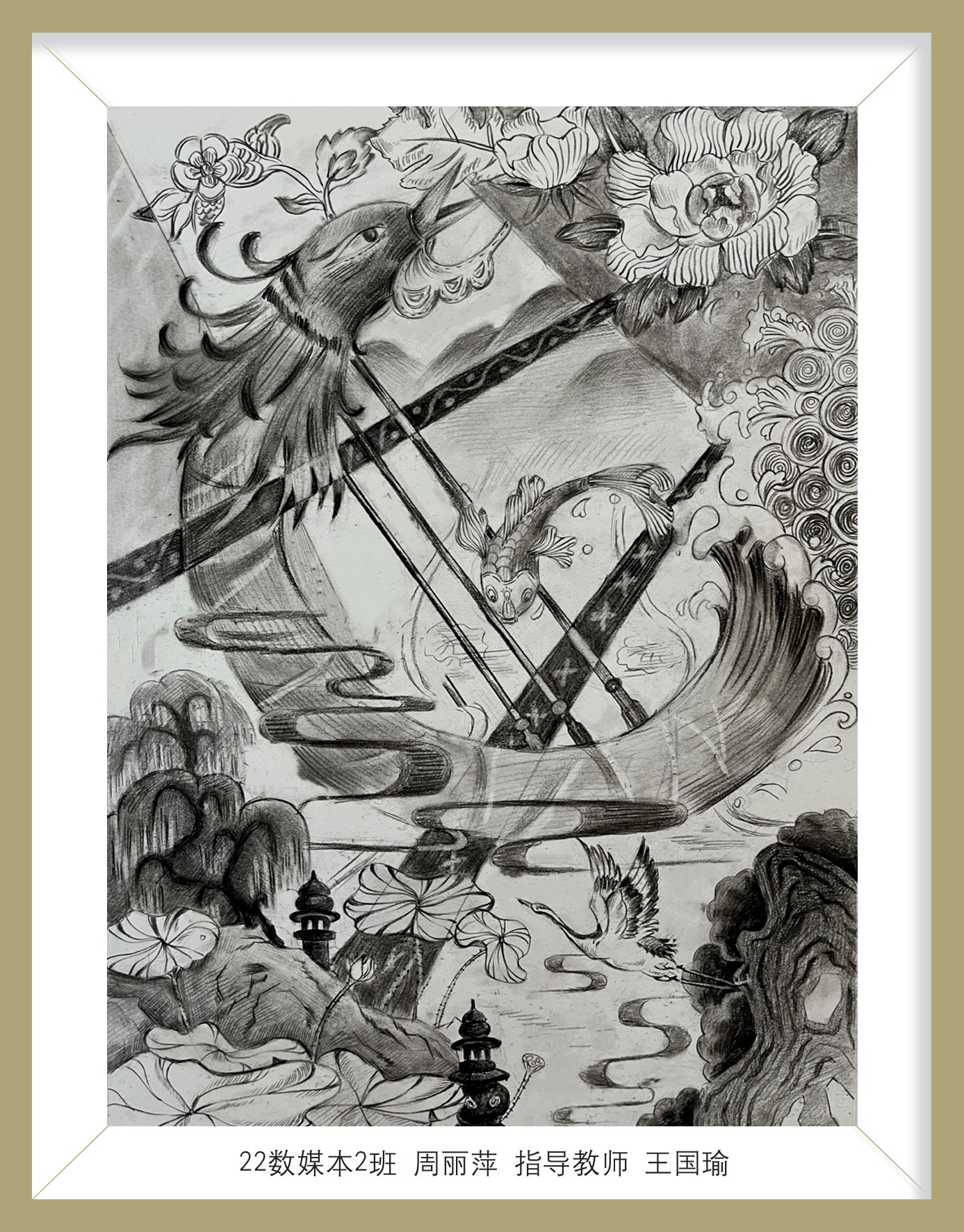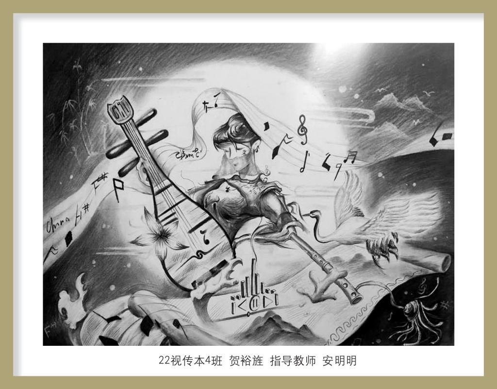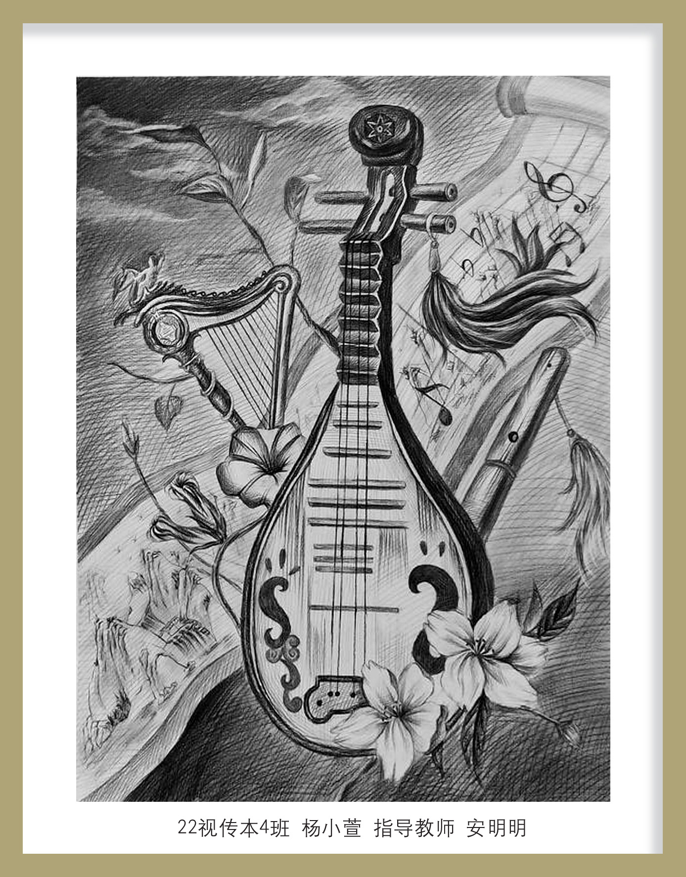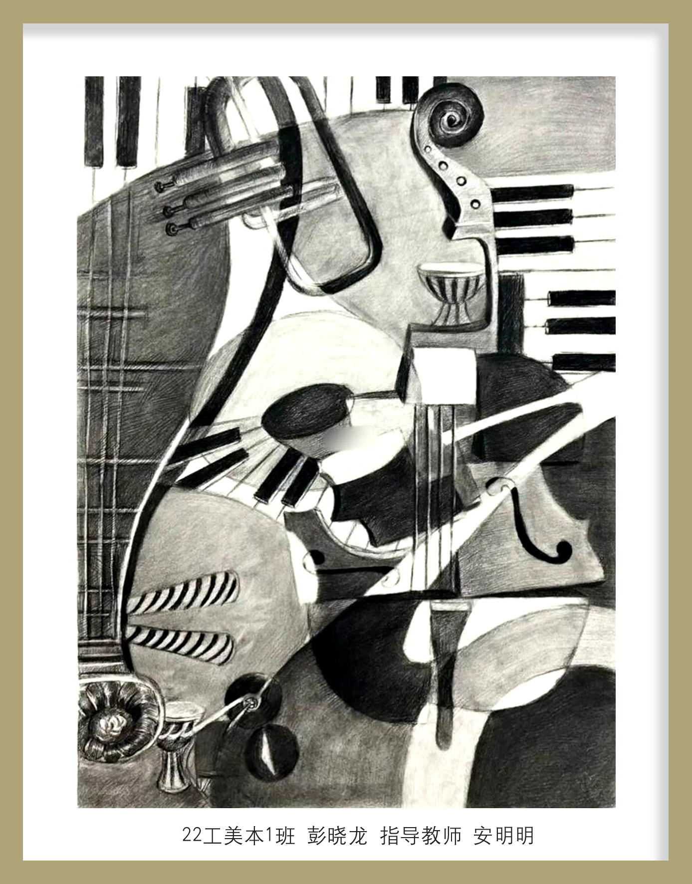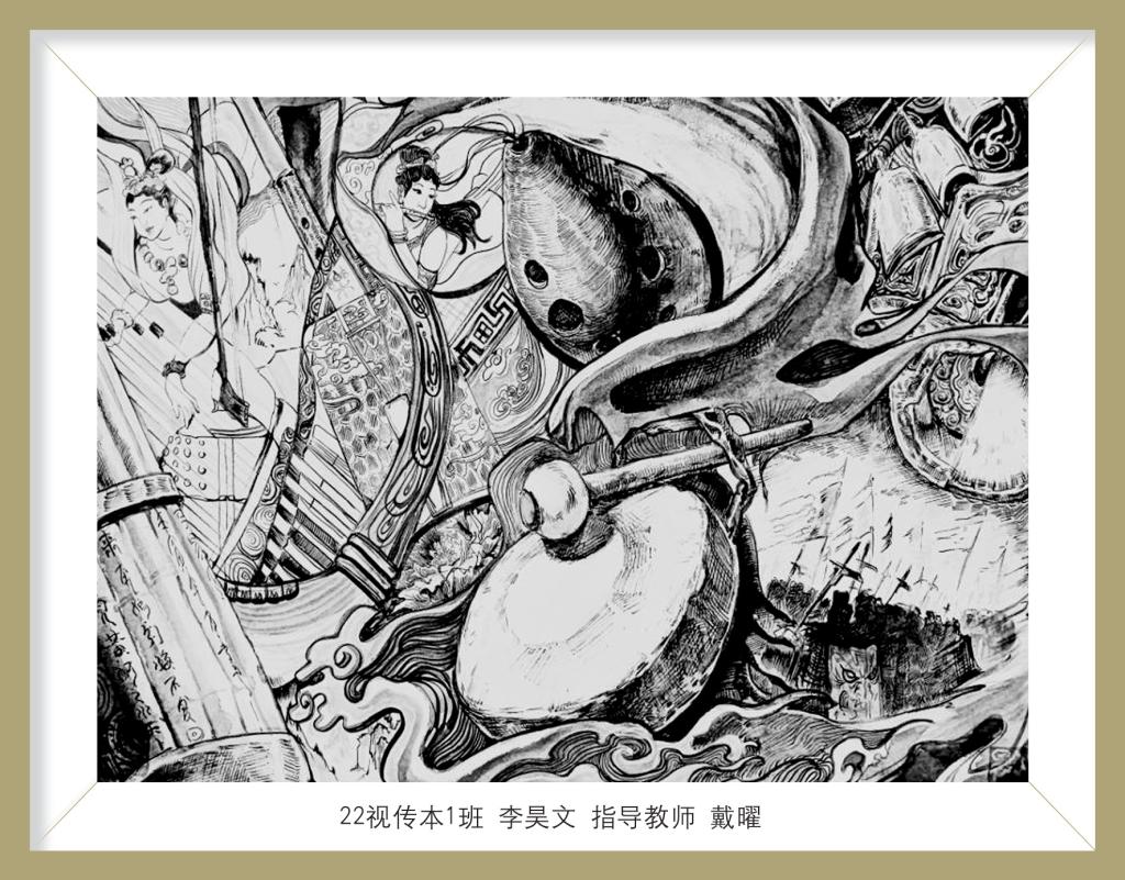 “综合创意素描训练”实训项目要求以“中国音乐”为主题,搜集相关元素(中国音乐符号、中国乐器、中国图形元素等)进行组合创意设计。要求学生综合运用各种造型设计方法进行大胆的创意设计表达,独立创作设计素描作品,以下展示的是部分学生优秀作品。