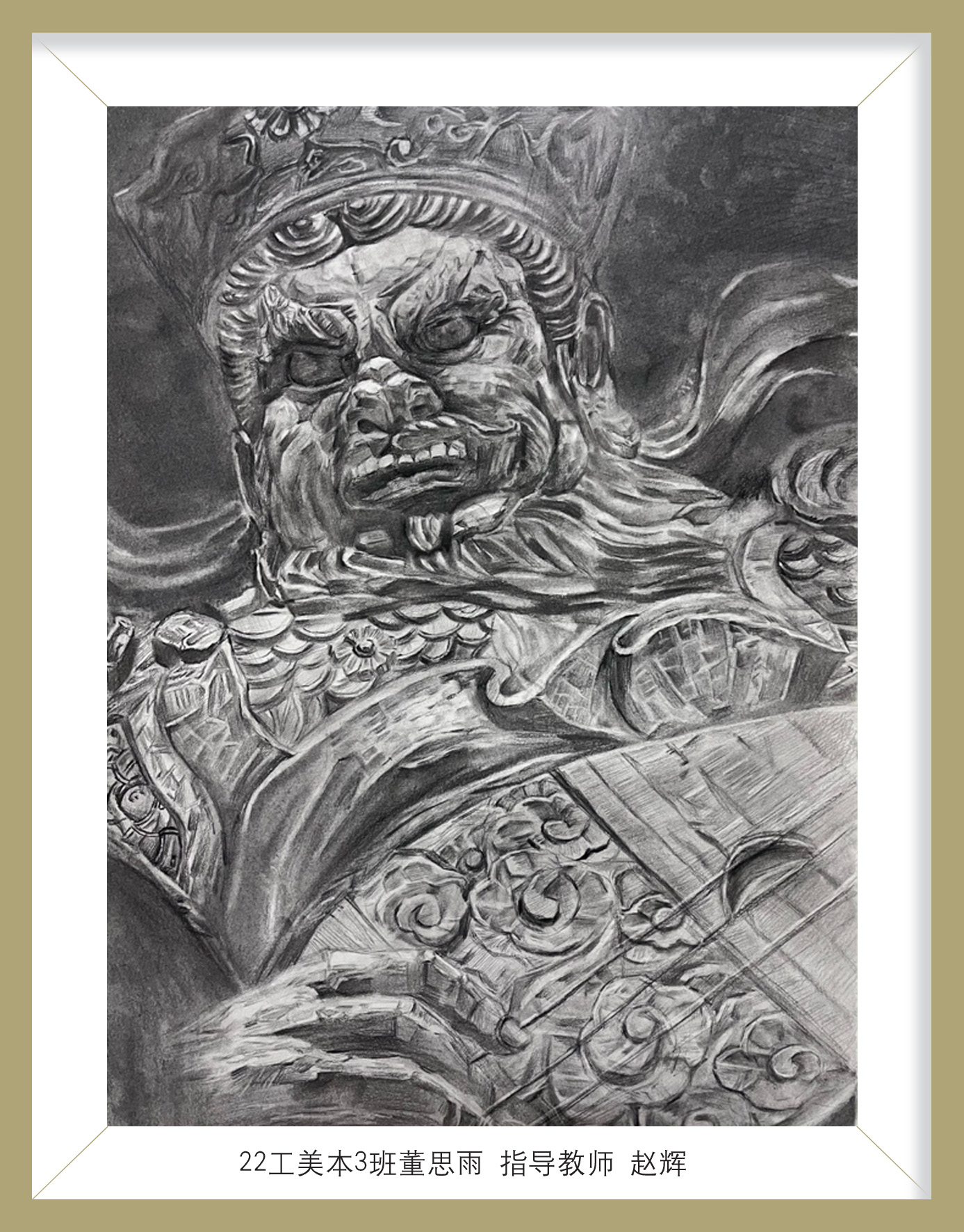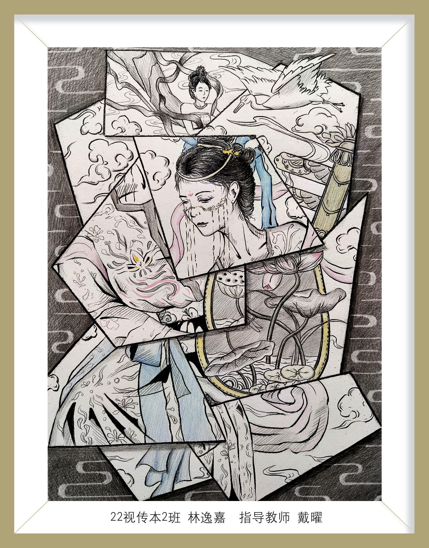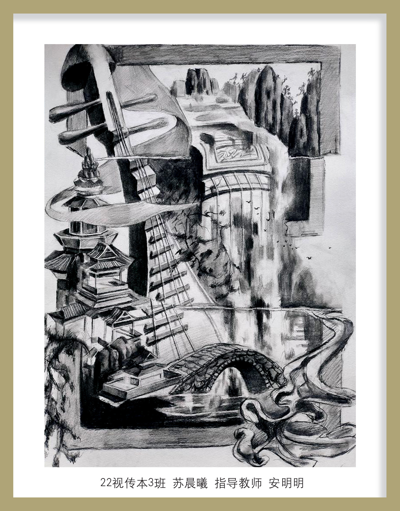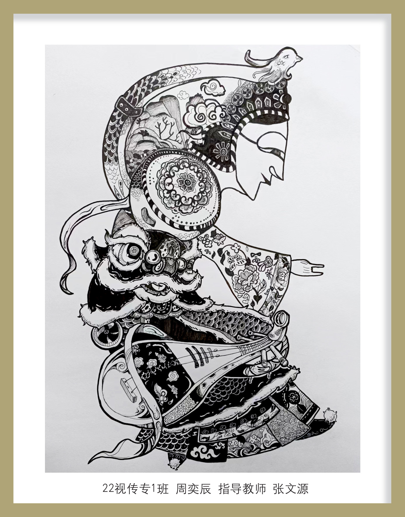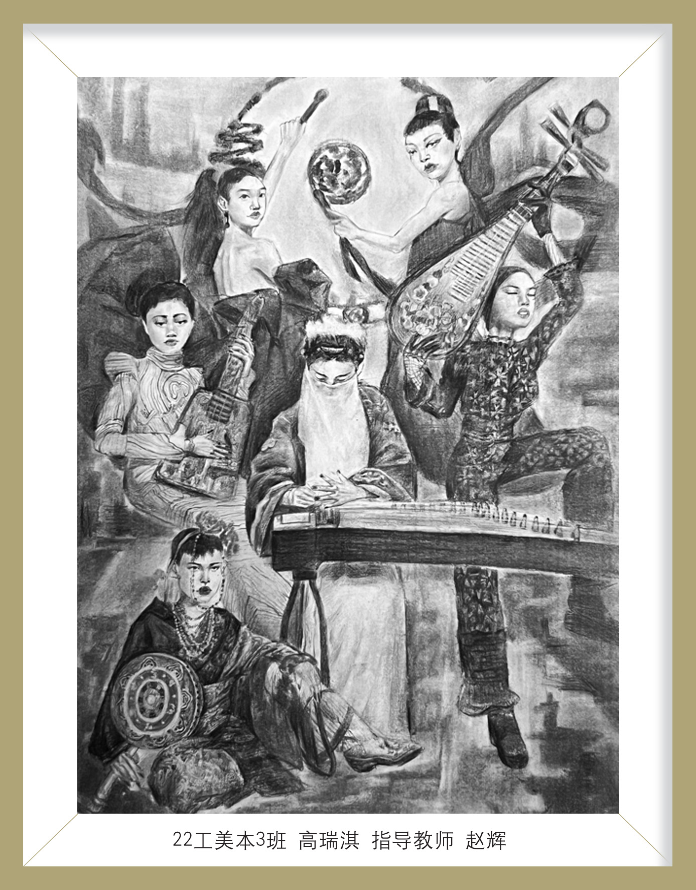 “综合创意素描训练”实训项目要求以“中国音乐”为主题,搜集相关元素(中国音乐符号、中国乐器、中国图形元素等)进行组合创意设计。要求学生综合运用各种造型设计方法进行大胆的创意设计表达,独立创作设计素描作品,以下展示的是部分学生优秀作品。