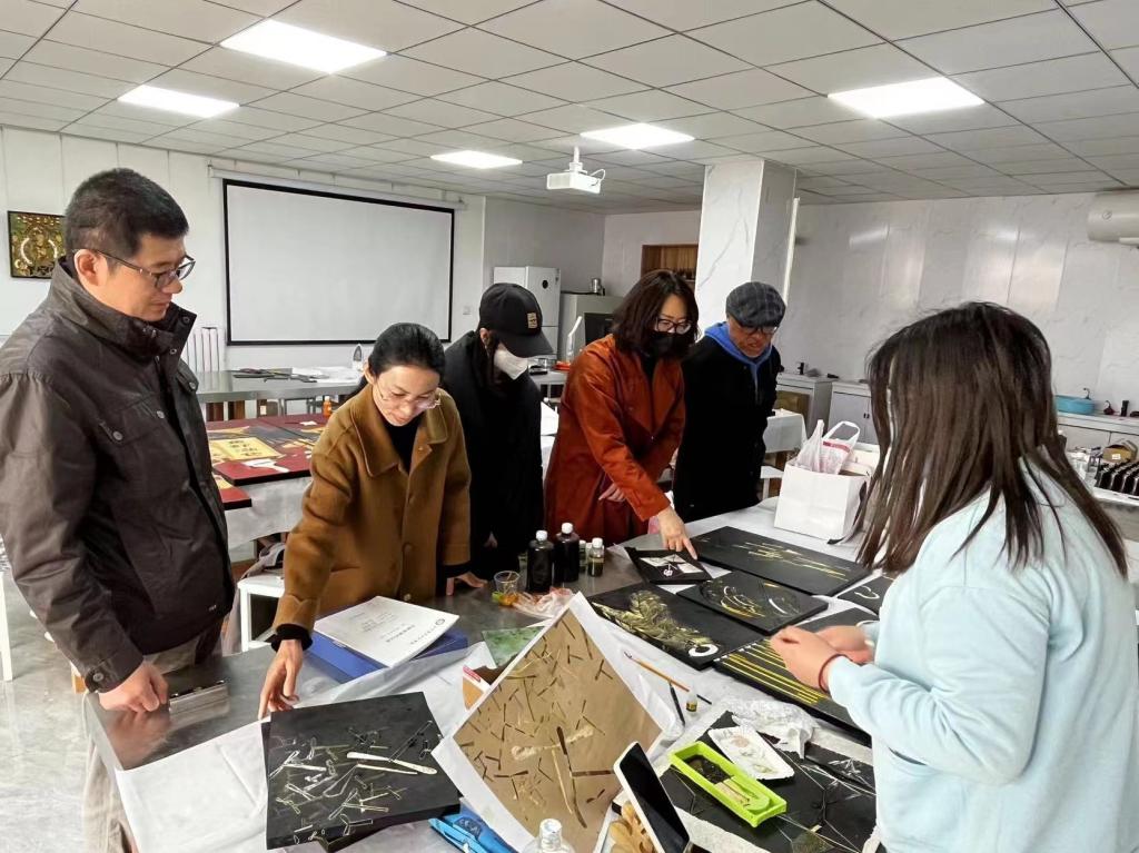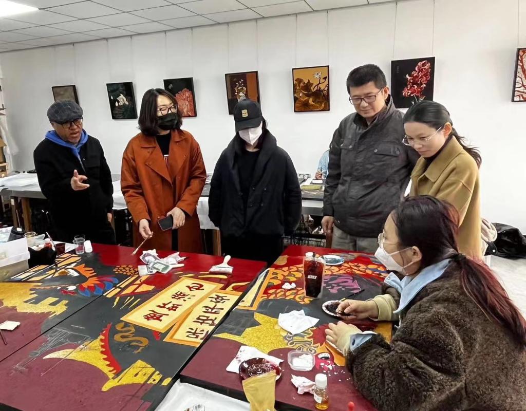 在漆艺实验室做毕业设计的张玉欢同学对自己的毕业设计作品《渔民节的祈福》做了相关讲解,作品的设计思路是将地方特色民俗文化与独特的传统手工艺紧密结合,形成一个集观赏性、工艺性、艺术价值和审美价值协调统一的漆画作品,从而增强民族自信,保护非物质文化遗产。该作品的灵感来源于山东省荣成市的一个民间传统节日—渔民节,又叫谷雨节、渔民开洋、谢洋节,是荣成渔民在独特的地理环境和历史文化背景下形成的一种独具特色的传统民俗活动。指导教师魏陵提出了创作中需要注意的事项。