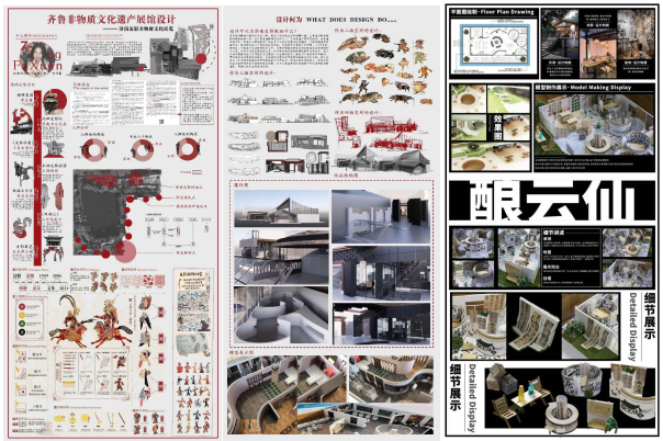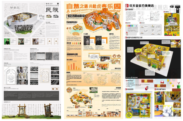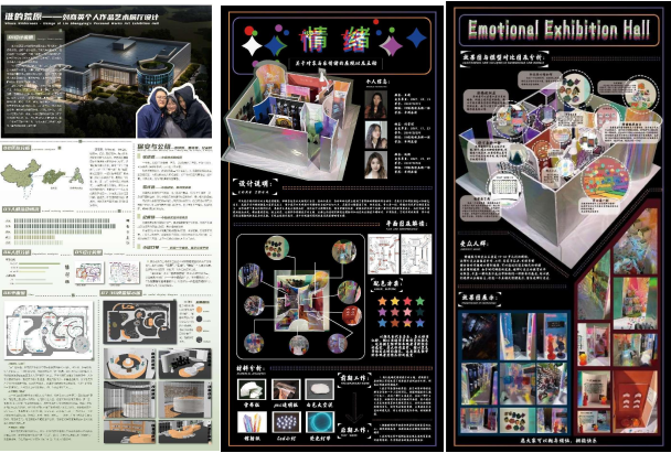 经过八周的课程学习与训练,22视觉传达设计品牌1、2班的同学们能够从三类展厅设计中选择主题并分组对展厅进行策划与设计,绘制出平面图、效果图、细节图及展板等内容,最终根据平面图及效果图选择合适材料并使用实验室中的3D打印机、雕刻机等辅助制作出相应的模型。下面是同学们的优秀作业展示: