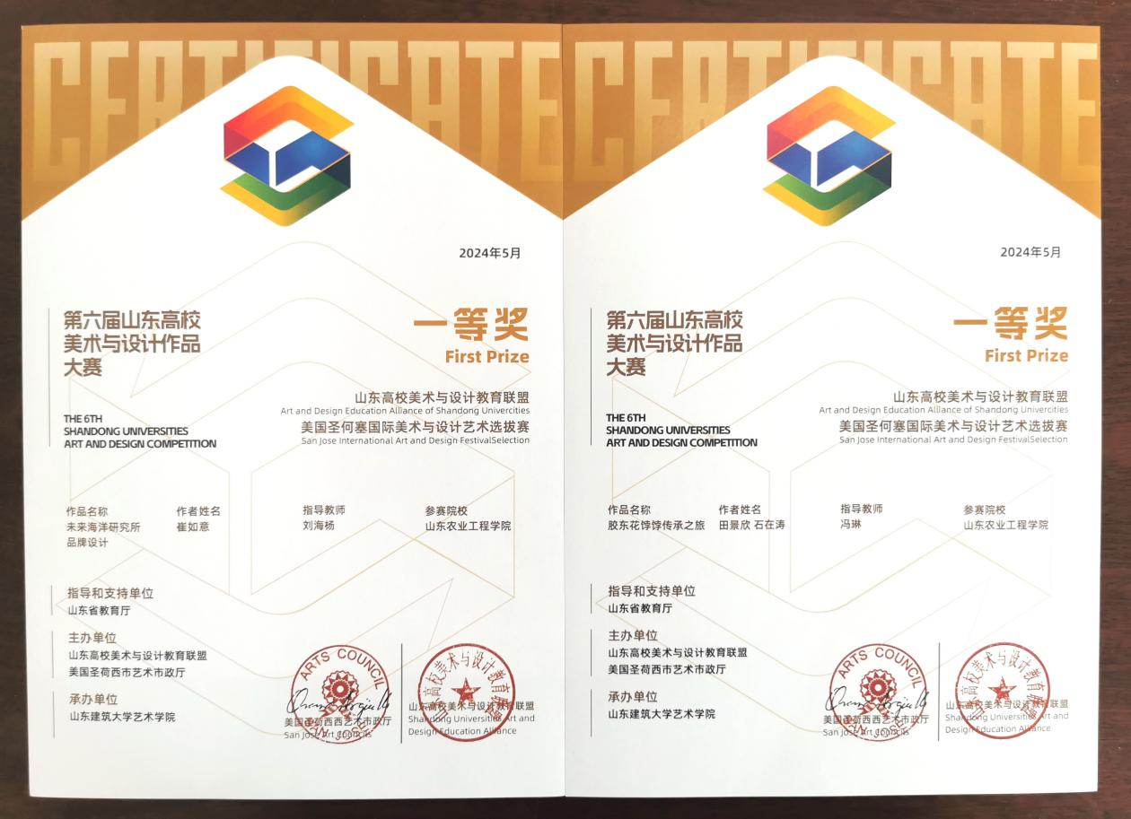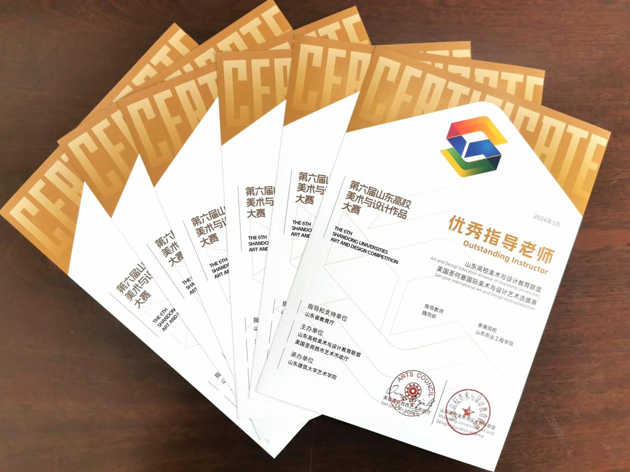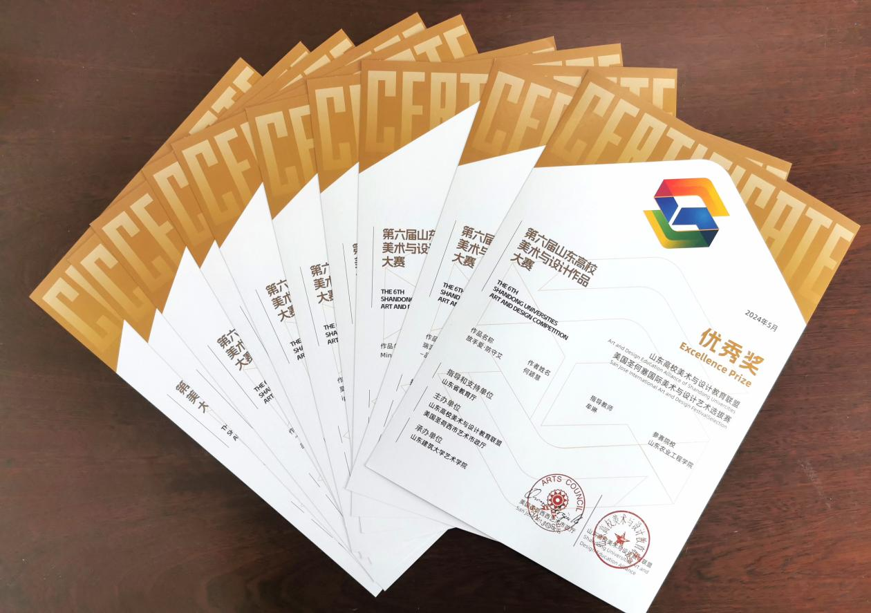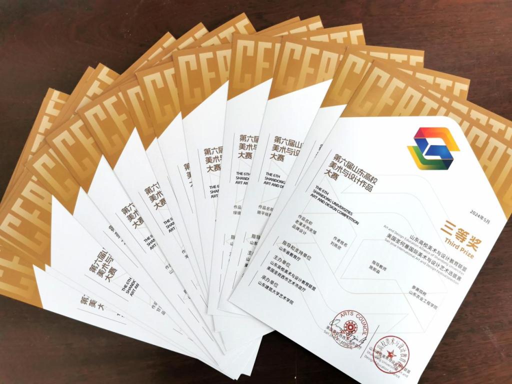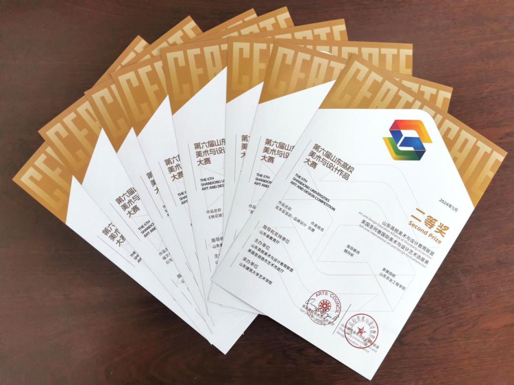 近日,艺术学院学生在“第六届山东高校美术与设计作品大赛”中荣获佳绩,共斩获一等奖3项,二等奖10余项,三等奖30余项,优秀奖20余项;多名专业教师荣获大赛优秀指导老师称号。