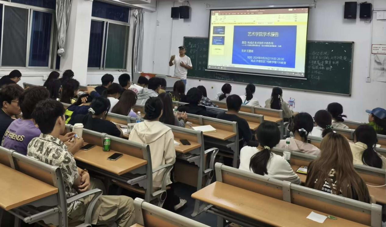 2024年9月26日19:00-20:30,王国瑜老师在济1教多106教室,以“构成在美术创作中的作用——以十四届全国美展作品(综合材料绘画和壁画)为例”为题,为同学们做了一场学术报告,学院60余名师生现场聆听。