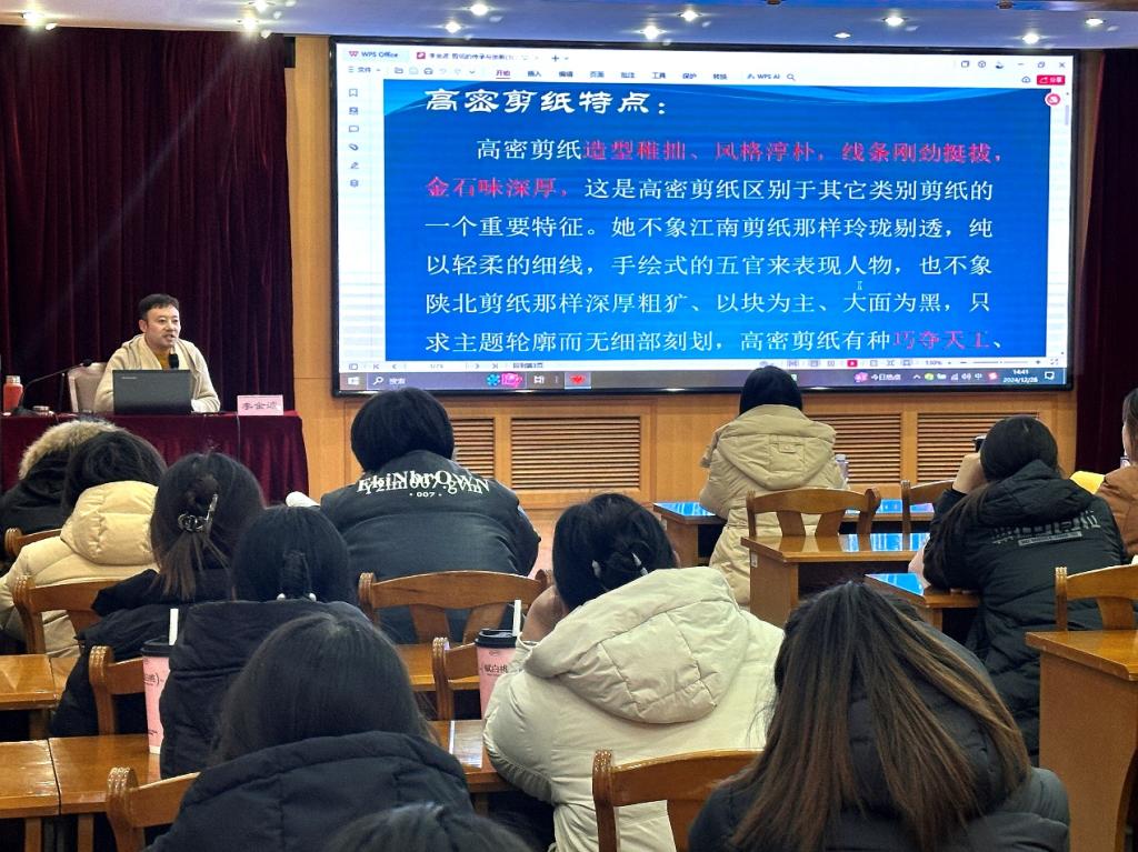 12月26日(周四)下午,在济南校区一号教学楼多功能厅艺术学院举办了一场非遗进校园的专题讲座。“国家级非物质文化遗产项目——高密剪纸”省级代表性传承人李金波先生应邀为师生们带来了一场关于剪纸艺术传承与创新的深度对话,讲座由学院副院长安明明主持。